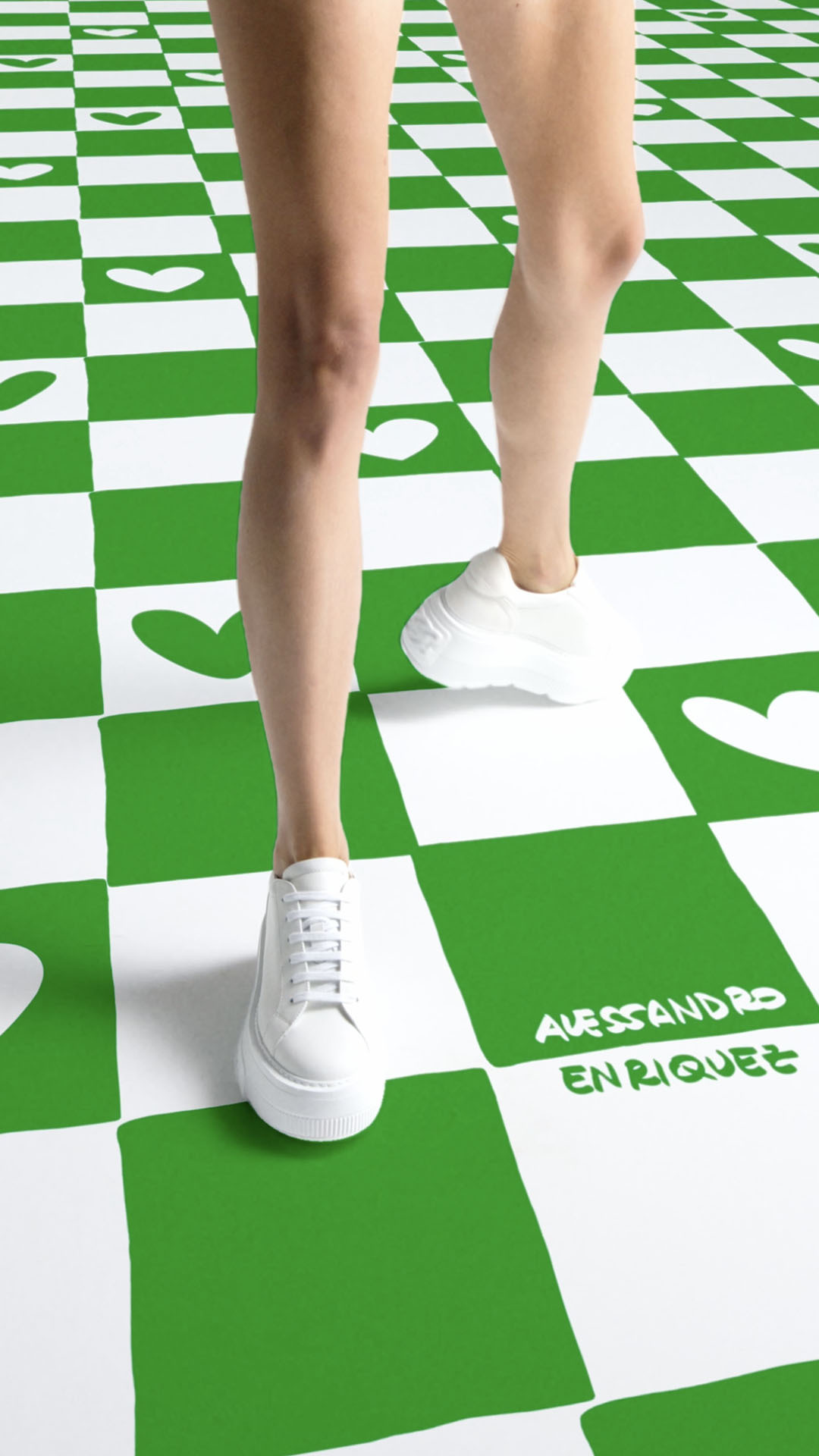 L’idea è quella di raccontare, attraverso un linguaggio onirico, la contaminazione creativa generata dall’incontro tra due mondi: il design iconico della maison e l’estetica pop di Enriquez. Nel film, le gambe della protagonista attraversano con passi leggeri e giocosi uno spazio bianco, indossando scarpe candide che, al contatto con i pattern e gli stilemi grafici del designer, si trasformano in un’esplosione di colori e motivi vibranti.