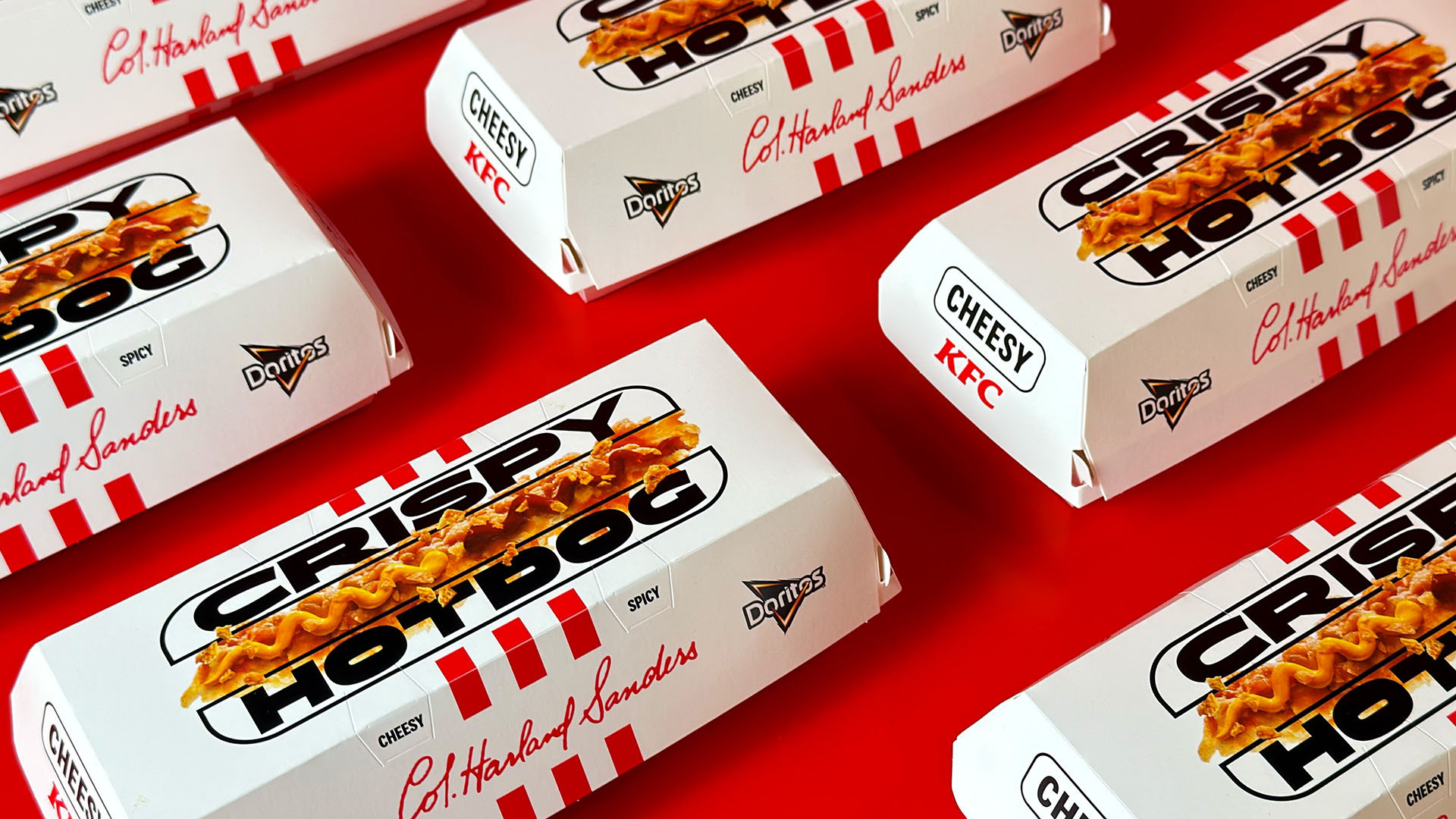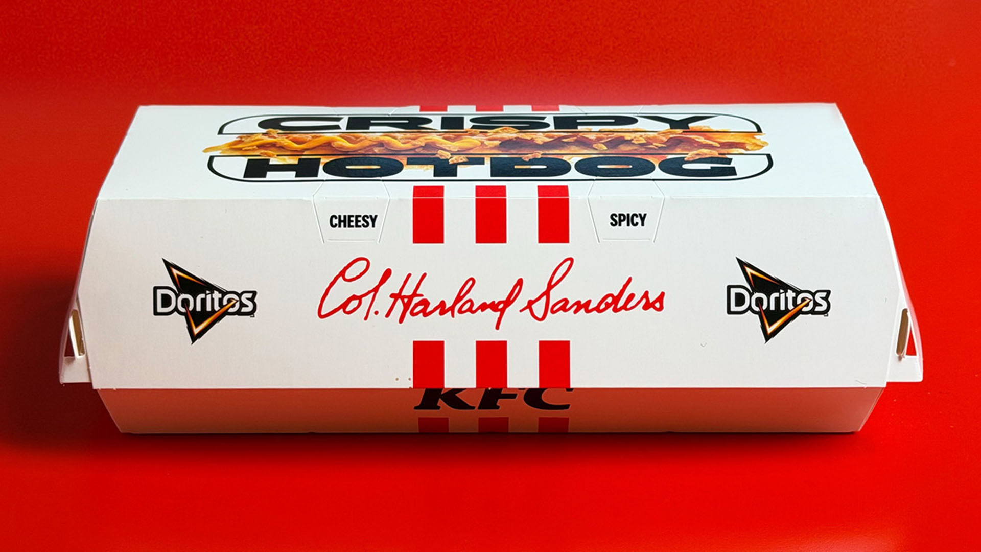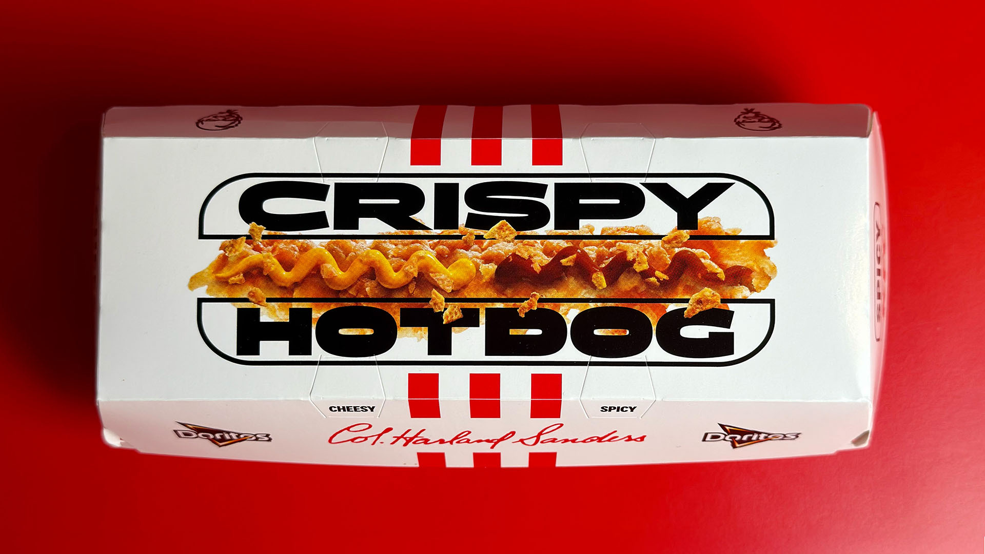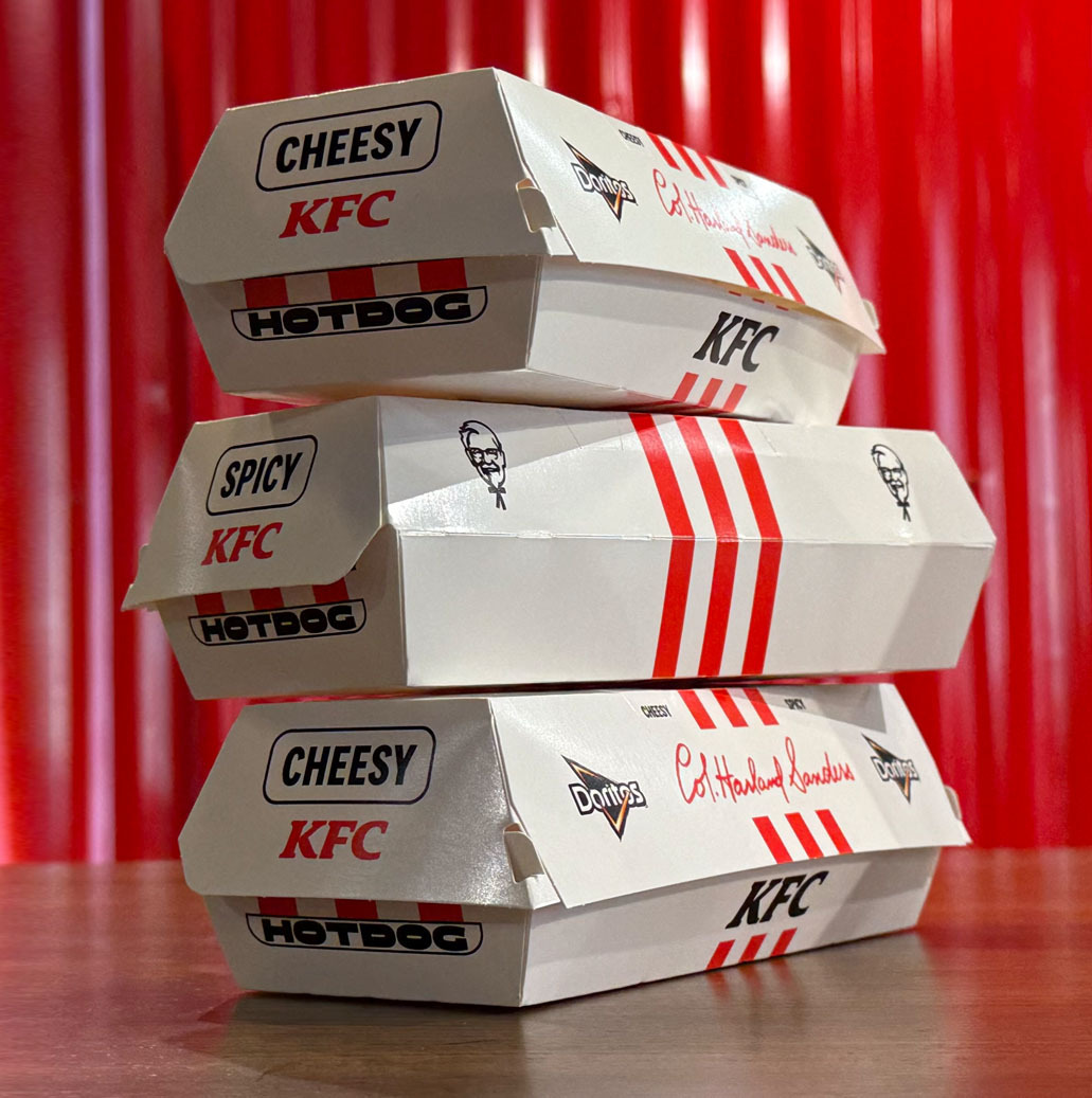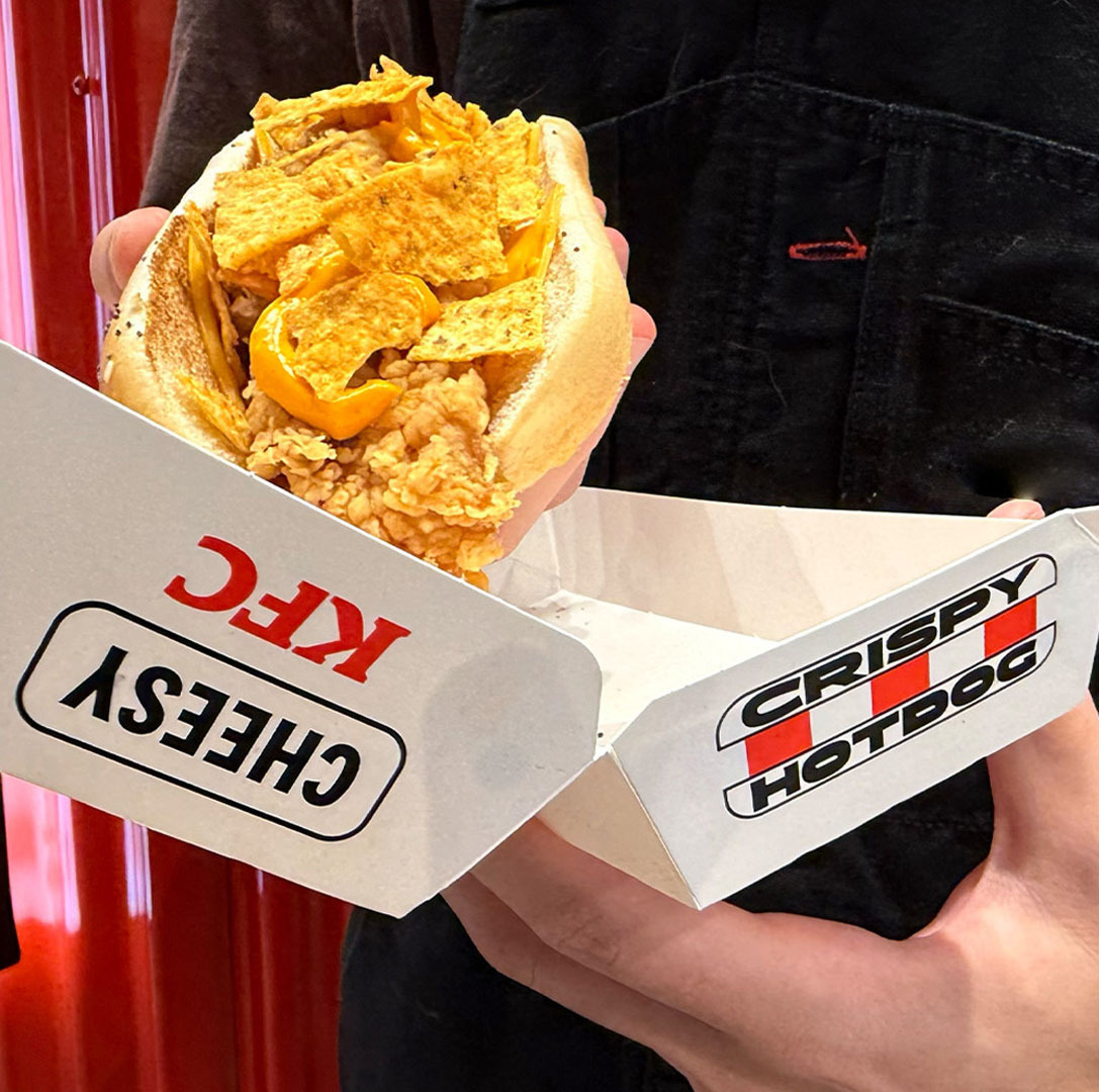 Nel 2025 KFC Italia lancia il Crispy Hot Dog: il primo hot dog senza würstel. I Tender diventano i protagonisti assoluti e il crumble di Doritos on top raddoppia la croccantezza. Il risultato? Un hot dog che sbriciola le regole di categoria.