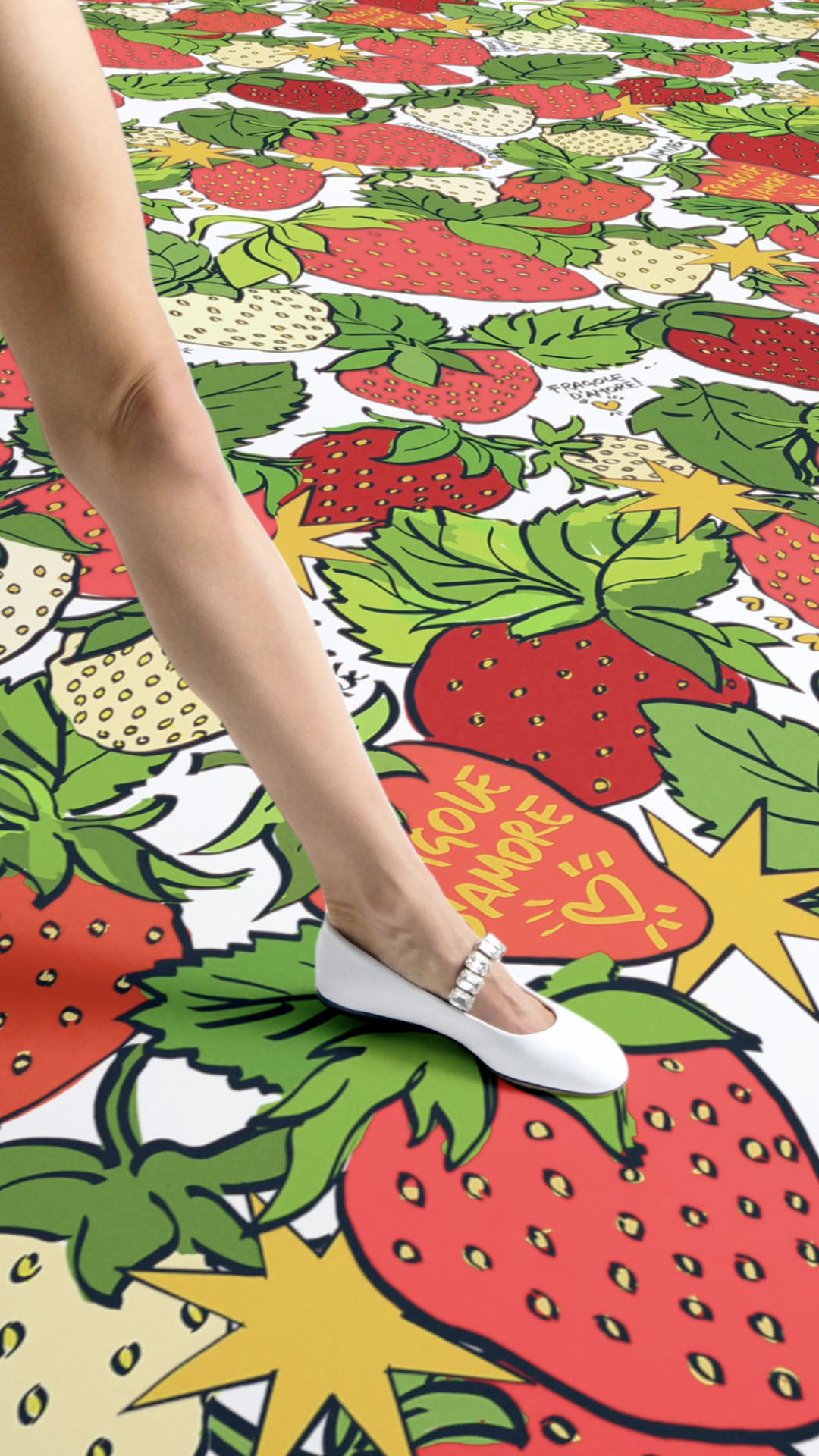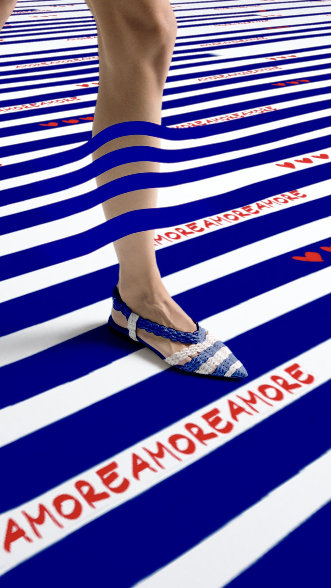 L’idea è quella di raccontare, attraverso un linguaggio onirico, la contaminazione creativa generata dall’incontro tra due mondi: il design iconico della maison e l’estetica pop di Enriquez. Nel film, le gambe della protagonista attraversano con passi leggeri e giocosi uno spazio bianco, indossando scarpe candide che, al contatto con i pattern e gli stilemi grafici del designer, si trasformano in un’esplosione di colori e motivi vibranti.