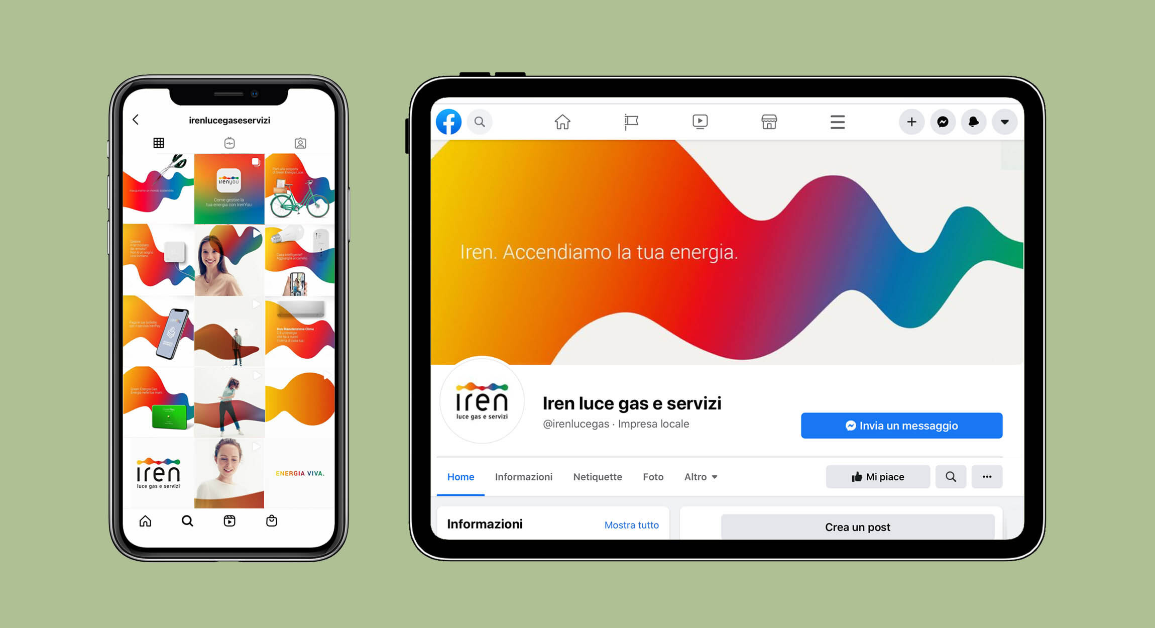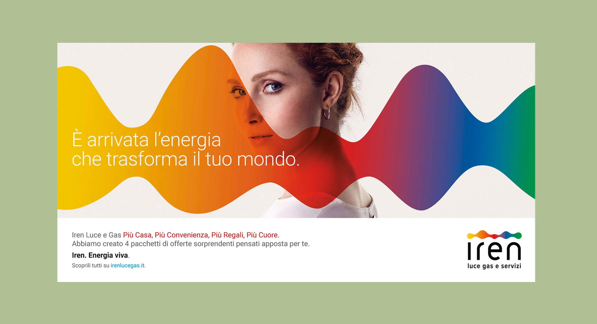 In the spring of 2020, the energy company Iren makes its debut on a national scale. Called by the Leagas Delaney Italia agency to collaborate in the development of the project, we have devised a communication format and an integrated launch campaign capable of recounting the lively and innovative aspect of the brand. The pictogram of the new logo has been expanded to create a fluid and multifaceted color spectrum that interacts with people, emotions and objects. The new Identity - very recognizable and at the same time versatile - has been declined on all communication touch points.