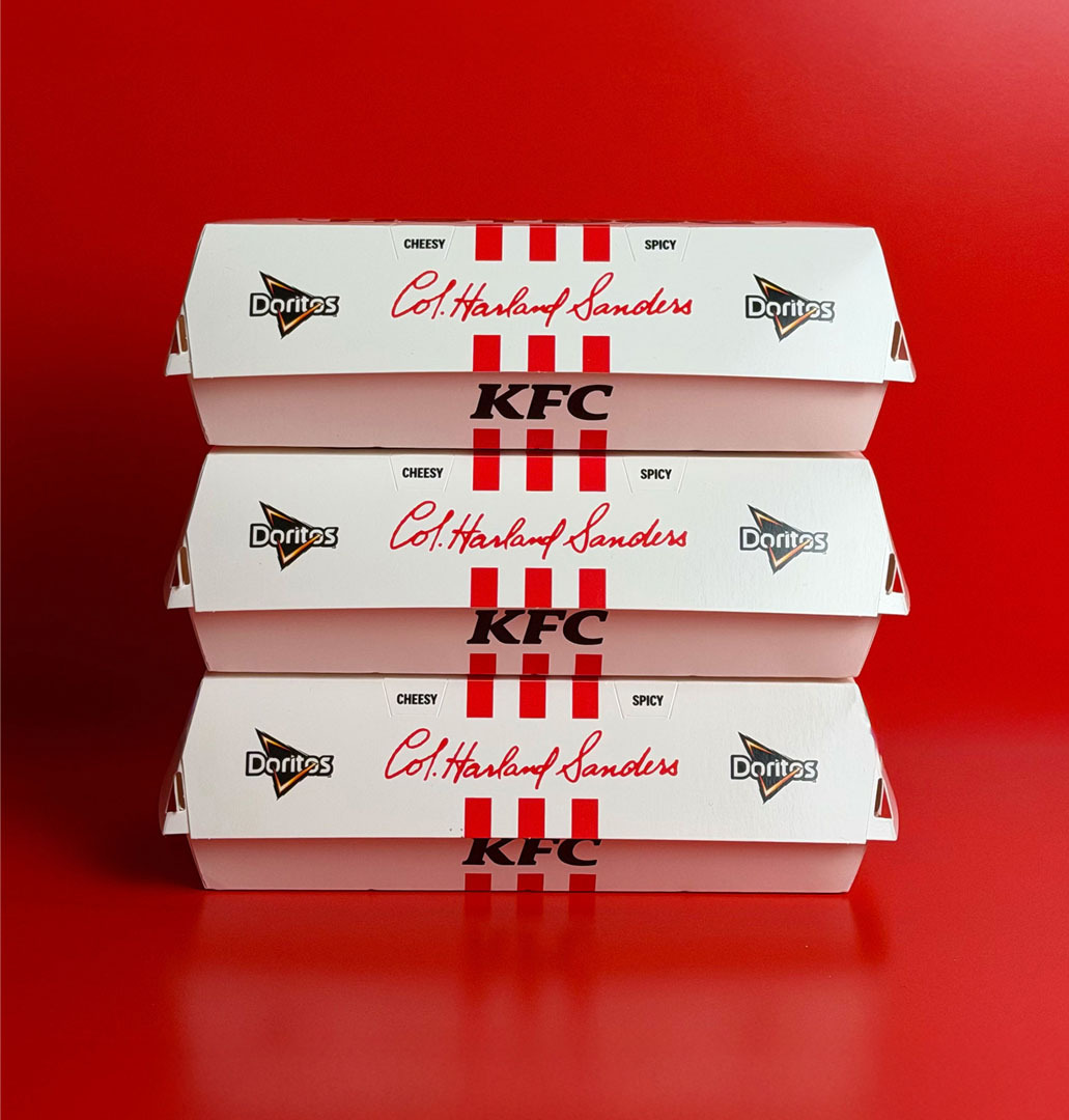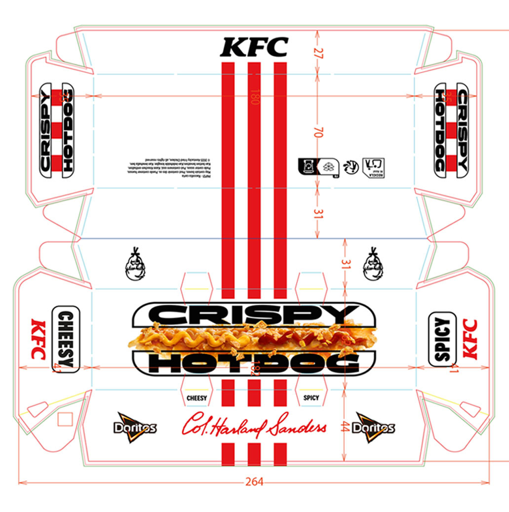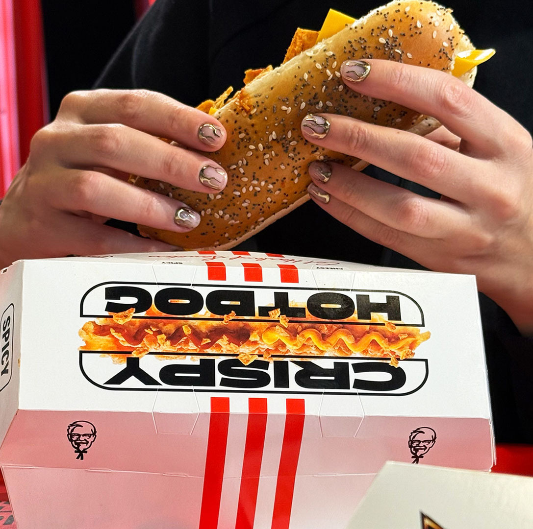 Nel 2025 KFC Italia lancia il Crispy Hot Dog: il primo hot dog senza würstel. I Tender diventano i protagonisti assoluti e il crumble di Doritos on top raddoppia la croccantezza. Il risultato? Un hot dog che sbriciola le regole di categoria.